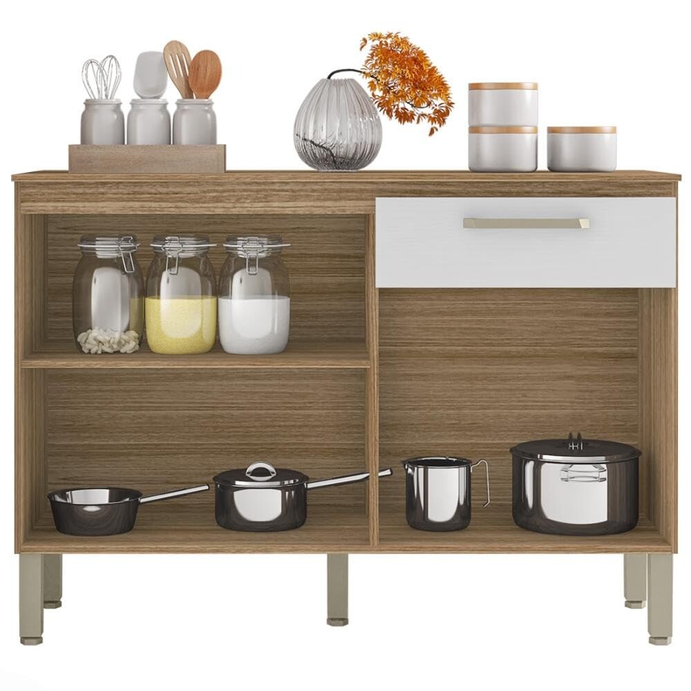 Com madeira reconstituída, que respeita o meio ambiente. Composto de três portas e uma gaveta, onde são utilizadas dobradiças e corrediças metálicas, tampo que traz a praticidade de utilização de decorações, utensílios para cozinha e até mesmo eletrodomésticos. Os puxadores são ergonômicos em plástico resistente (poliestireno). Possui pés reguláveis em plástico resistente que garantem a estabilidade do produto. Acabamento com pintura UV.